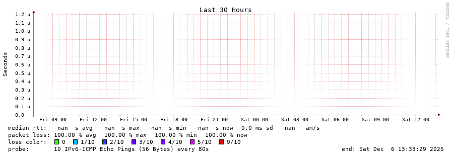traceroute to fd69:226f:3a3c::2 (fd69:226f:3a3c::2), 30 hops max, 80 byte packets - Generated at 2025-12-06 13:15:01 3 > 4 > 5 > 6 > 7 > 8 > 9 > 10 > 11 > 12 > 13 > 14 > 15 > 16 > 17 > 18 > 19 > 20 > 21 > 22 > 23 > 24 > 25 > 26 > 27 > 28 > 29 > 30 >