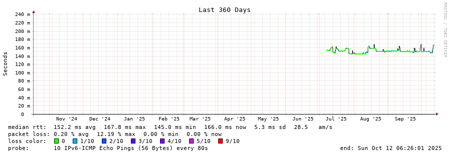 traceroute to 2604:2dc0:202:200::1f9 (2604:2dc0:202:200::1f9), 30 hops max, 80 byte packets - Generated at 2025-10-12 06:15:02